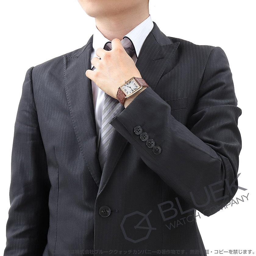 角形レールウェイ分目盛り内側にブルーの剣型針、外側にブラックローマ数字をスッキリ備えたダイヤルにはカルティエの古典美が漂います。