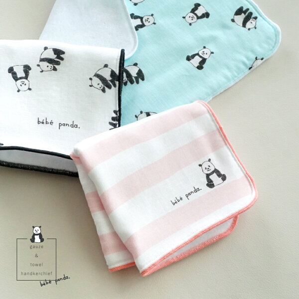 【bebe panda】ガーゼタオルハンカチ 24cm×24cm 表地はサラッとガーゼ、裏地はふんわり吸水タオル 表は肌触りのやさしいガーゼ生地、裏にはふわふわのタオル生地を使用しています。